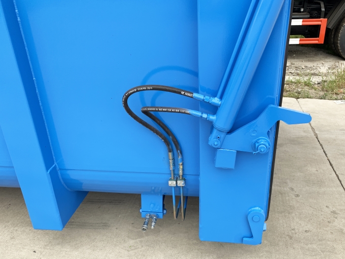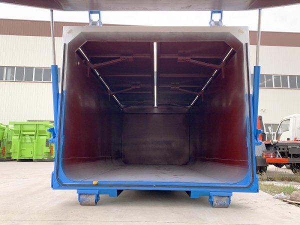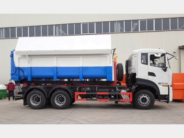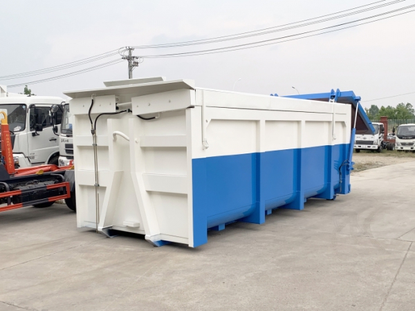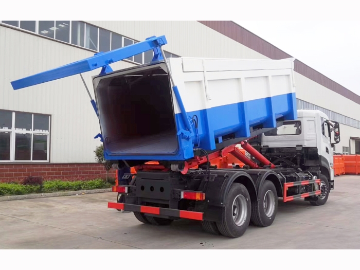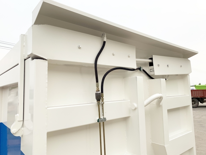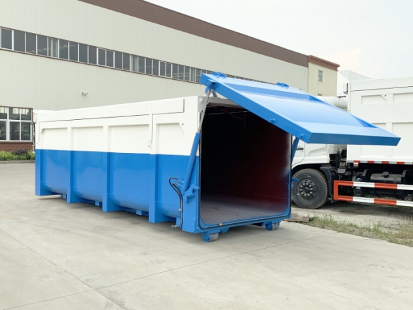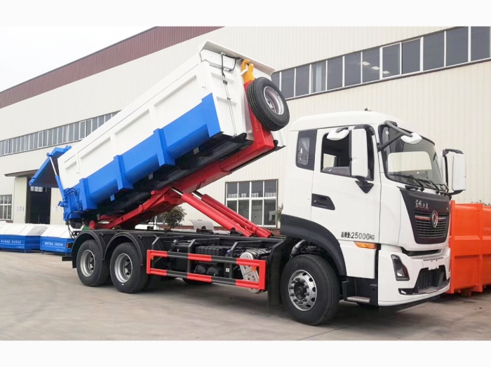 運輸介質為:泥污垃圾,液壓后門機構密封,箱體頂部為翼展蓋,可翻轉打開,主要是利用勾臂垃圾車底盤自帶的發動機為動力,通過變速箱上安裝的取力器,取力器處安裝油泵,采用液壓機構手動或電控來實現箱體的上鉤、下卸、自卸等功能。車輛的箱體采用優質炭鋼板全密封焊接結構,具有重量輕、不產生二次污染等優點。