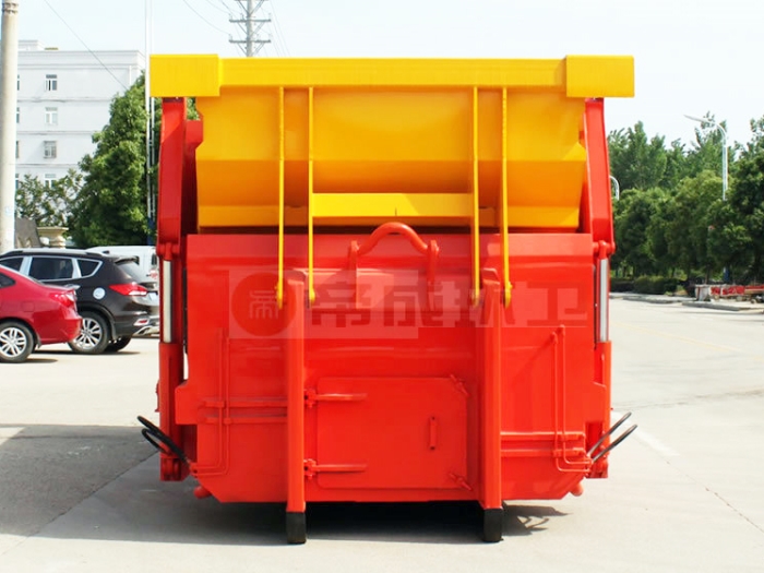 ② 箱體,主體采用高強(qiáng)度鋼板組焊而成,箱體側(cè)板采用2500寬5mm厚Q345猛鋼整板一次壓制成形,整體采用流線型設(shè)計(jì),是垃圾的填裝與儲(chǔ)存的主要空間。與尾門配合處安裝有進(jìn)口密封條,與壓縮機(jī)連接處設(shè)置有防回彈裝置。