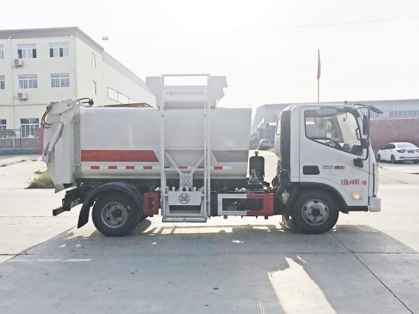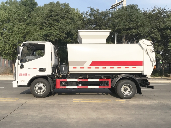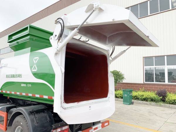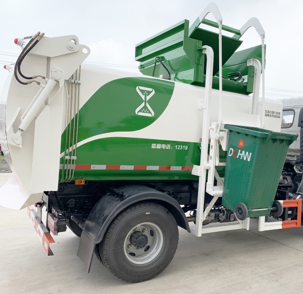 餐廚垃圾車是一種用于收集和運輸生活垃圾、食品垃圾(泔水)及城市淤泥的專用車輛。采用側提桶上料方式進行餐廚垃圾收集,采用自卸方式進行卸料。先進的弧形進料口設計配上完美得液壓刮板系統,使裝料更加快捷和順暢,尾門密封液壓鎖緊系統,確保運輸途中滴水不漏。 主要結構:汽車底盤、垃圾箱體、底架側提桶機構、后門總成、液壓刮板系統、液壓系統和電控系統。液壓系統及電控系統由油泵、油缸、郵箱、電液閥、PLC單元、行程開關和開關等組成。同時本產品選配高壓清洗系統,自動稱重系統和衛星定位互聯網系統,自帶水箱,可以在現場對本車及垃圾桶進行沖洗。是城鎮餐廚垃圾收集運輸的理想工具。