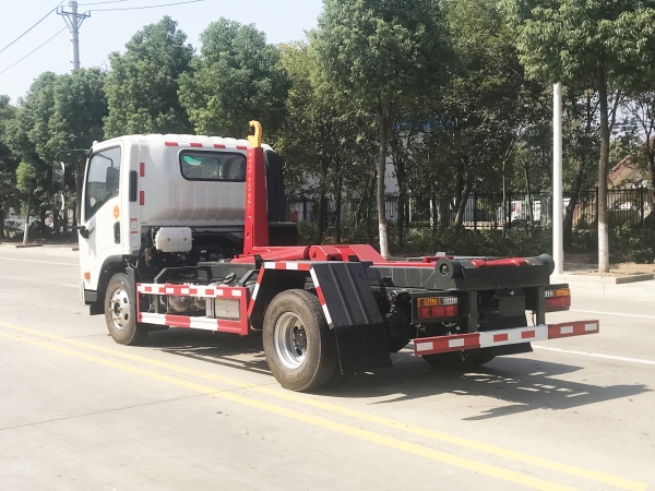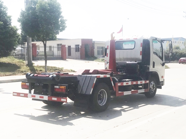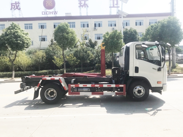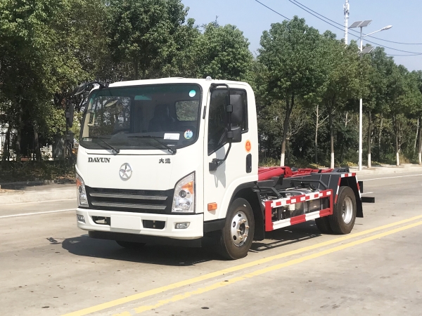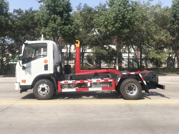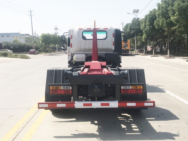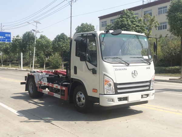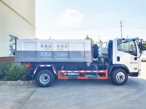 車廂可卸載式垃圾車,又稱勾臂式垃圾車、拉臂式垃圾車。該車廣泛適用與城市街道學校垃圾處理,可一車配備多個斗,各個垃圾點放置多個,帶自卸功能,液壓操作,方便傾倒。在平日里可將車載垃圾箱放置到各個垃圾收集站,待垃圾收集滿后,該車可直接開赴至垃圾站,通過液壓系統的操控,可將垃圾車后座上加裝的勾臂放下,掛住站內垃圾箱前端的連接點,將垃圾箱拉至車體的后座上,此時即可啟動車輛,將垃圾運送至垃圾處理站內,進行自卸式傾倒。該車主要的優點就是可一車配多斗,一輛車就可以維持數個垃圾收集站的運轉,效率高,且箱體為密封式設計,不會造成二次污染。
