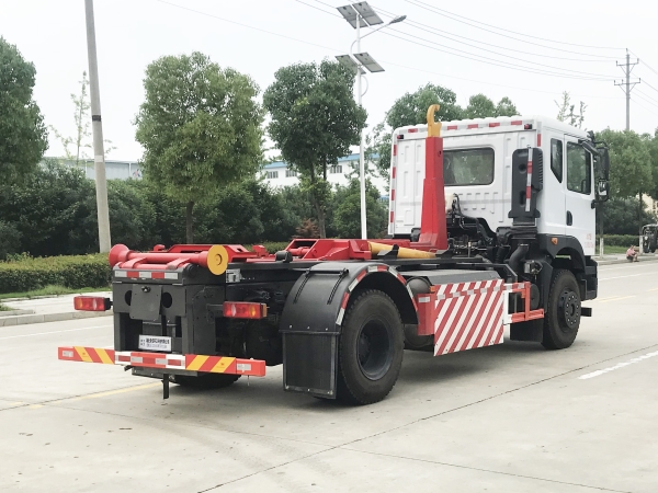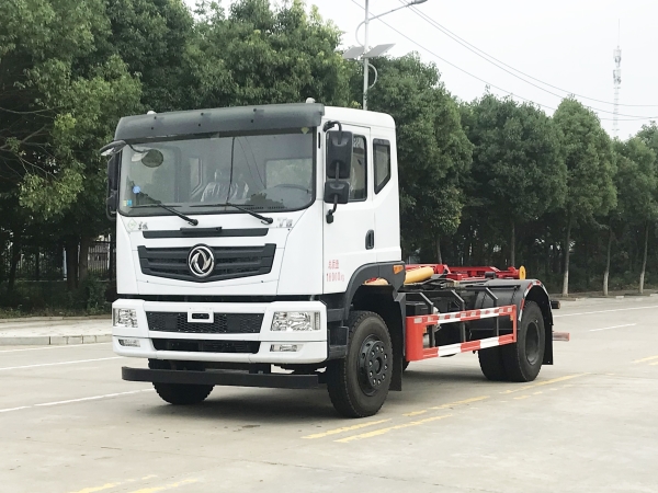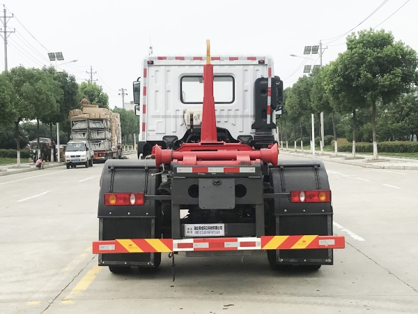 車廂可卸載式垃圾車,又稱勾臂式垃圾車、拉臂式垃圾車。該車廣泛適用與城市街道學校垃圾處理,可一車配備多個斗,各個垃圾點放置多個,帶自卸功能,液壓操作,方便傾倒。在平日里可將車載垃圾箱放置到各個垃圾收集站,待垃圾收集滿后,該車可直接開赴至垃圾站,通過液壓系統的操控,可將垃圾車后座上加裝的勾臂放下,掛住站內垃圾箱前端的連接點,將垃圾箱拉至車體的后座上,此時即可啟動車輛,將垃圾運送至垃圾處理站內,進行自卸式傾倒。該車主要的優點就是可一車配多斗,一輛車就可以維持數個垃圾收集站的運轉,效率高,且箱體為密封式設計,不會造成二次污染。