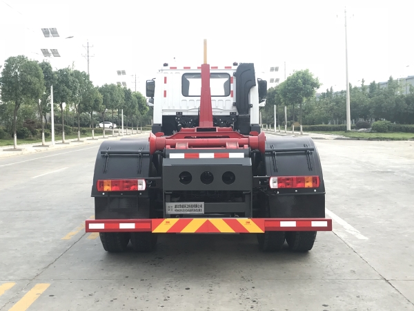 車廂可卸載式垃圾車,又稱勾臂式垃圾車、拉臂式垃圾車。該車廣泛適用與城市街道學校垃圾處理,可一車配備多個斗,各個垃圾點放置多個,帶自卸功能,液壓操作,方便傾倒。在平日里可將車載垃圾箱放置到各個垃圾收集站,待垃圾收集滿后,該車可直接開赴至垃圾站,通過液壓系統的操控,可將垃圾車后座上加裝的勾臂放下,掛住站內垃圾箱前端的連接點,將垃圾箱拉至車體的后座上,此時即可啟動車輛,將垃圾運送至垃圾處理站內,進行自卸式傾倒。該車主要的優點就是可一車配多斗,一輛車就可以維持數個垃圾收集站的運轉,效率高,且箱體為密封式設計,不會造成二次污染。